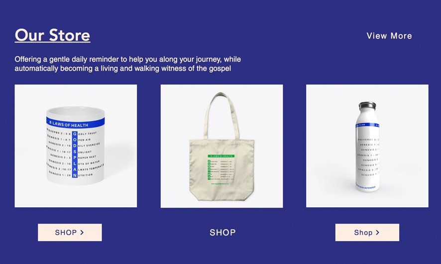 The 8 laws of health are found in the Holy Bible and is God's plan to restore and maintain good health. Our products are a gentle daily reminder to help aid you on your journey, while automatically becoming a living and walking witness of the gospel.